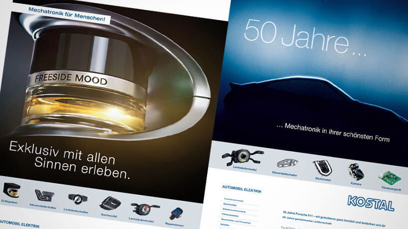 Für das Unternehmen KOSTAL mit seinen einzelnen Geschäftsbereichen (Automobil Elektrik, Industrie Elektrik, Solar Elektrik, Kontakt Systeme und Systemhaus Energieeffizienz) erstellen wir im Rahmen des von uns entwickelten Corporate Designs Broschüren, Flyer, Anzeigen, konzipieren Messeauftritte und sind im digitalen Bereich zuständig für die Unternehmenswebseiten.